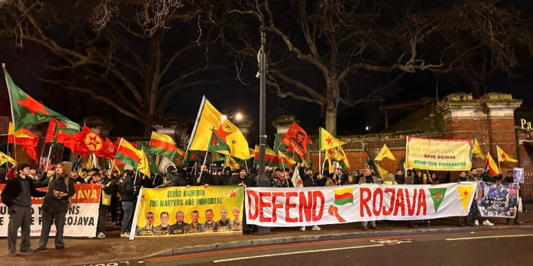 Londra’da Kürt Halk Meclisi’nin çağrısıyla Rojava’ya dönük saldırılara karşı yüzlerce Kürdistanlı Manor House İstasyonu önünde bir araya geldi. Eylem, Kürdistan Özgürlük Şehitleri anısına yapılan bir dakikalık saygı duruşu ile başladı. Ardından sık sık, “Bijî Berxwedana Rojava”, “Bijî Rojava”, “Kürdistan Yek e”, “Bijî YPG/YPJ”, “Jin Jiyan Azadî” sloganları atıldı. Kitle, “Defend Rojava” pankartı açarken Rojava devrim marşları okundu.