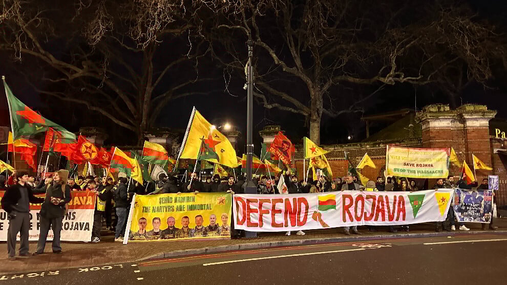 Londra’da Kürt Halk Meclisi’nin çağrısıyla Rojava’ya dönük saldırılara karşı yüzlerce Kürdistanlı Manor House İstasyonu önünde bir araya geldi. Eylem, Kürdistan Özgürlük Şehitleri anısına yapılan bir dakikalık saygı duruşu ile başladı. Ardından sık sık, “Bijî Berxwedana Rojava”, “Bijî Rojava”, “Kürdistan Yek e”, “Bijî YPG/YPJ”, “Jin Jiyan Azadî” sloganları atıldı. Kitle, “Defend Rojava” pankartı açarken Rojava devrim marşları okundu.