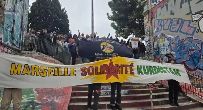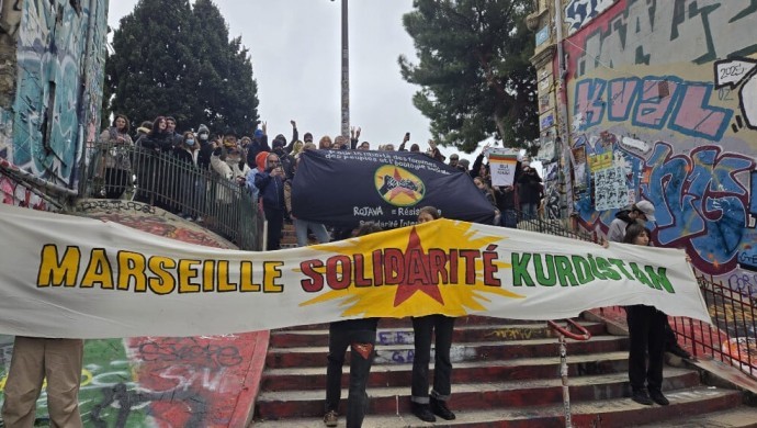 Fransa’nın Marsilya kentinde Collectif Internationaliste Marseille–Kurdistan (CIMK) öncülüğünde Rojava ile dayanışma yürüyüşü gerçekleştirildi. Marsilya’nın La Plaine Meydanı’nda bir araya gelen Kürt dostu Fransızlar ve aktivistler, yürüyüş boyunca “Marseille Solidarité Kurdistan” pankartı açtı. Eylemde ayrıca “Rojava ne bi tenê ye”, “Bijî berxwedana Rojava” ve “Jin, jiyan, azadî” sloganları atıldı.