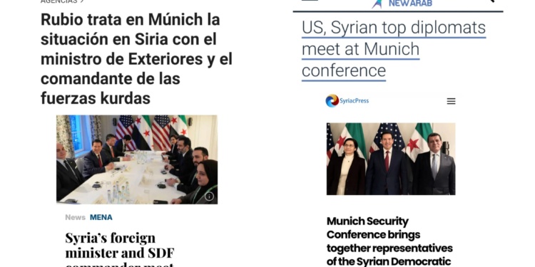 İspanya merkezli Infobae ve Europapress haber ajansı, “Rubio, Münih’te Suriye’deki gelişmeleri Dışişleri Bakanı ve Kürt güçleri komutanıyla ele aldı” başlığıyla ABD Dışişleri Bakanı Marco Rubio’nun, Mazlum Ebdî, Îlham Ehmed ve Suriye Geçici Hükümeti Dışişleri Bakanı Esad Şeybani ile gerçekleştirdiği görüşmeleri manşetine taşıdı.