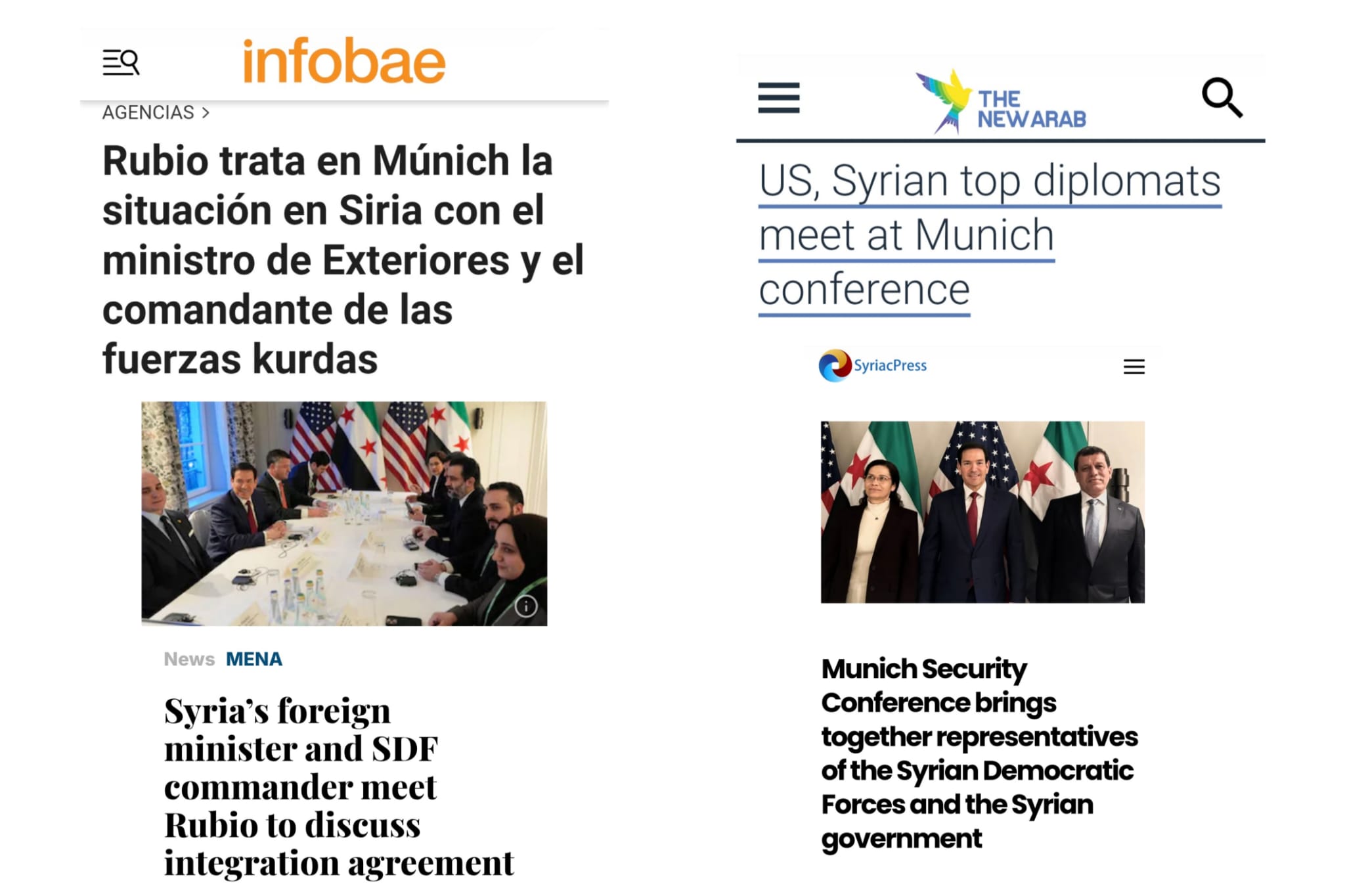 İspanya merkezli Infobae ve Europapress haber ajansı, “Rubio, Münih’te Suriye’deki gelişmeleri Dışişleri Bakanı ve Kürt güçleri komutanıyla ele aldı” başlığıyla ABD Dışişleri Bakanı Marco Rubio’nun, Mazlum Ebdî, Îlham Ehmed ve Suriye Geçici Hükümeti Dışişleri Bakanı Esad Şeybani ile gerçekleştirdiği görüşmeleri manşetine taşıdı.
