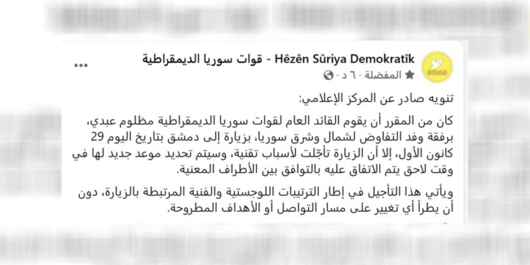Demokratik Suriye Güçleri (QSD) Genel Komutanı Mazlum Ebdi’nin, müzakere heyetiyle birlikte Şam’a bugün, ayın 29’unda gerçekleştirmesi planlanan ziyaretin ertelendiği bildirildi.