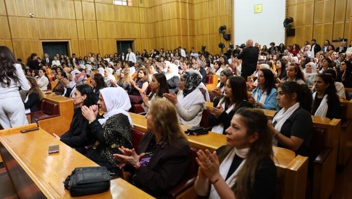 Halkların Eşitlik ve Demokrasi Partisi (DEM Parti) Meclis Grup Toplantısı’nı canlı veren Meclis TV, yayın akışı sırasında gruba katılan kadınların attığı Kürtçe sloganların sesini kıstı.