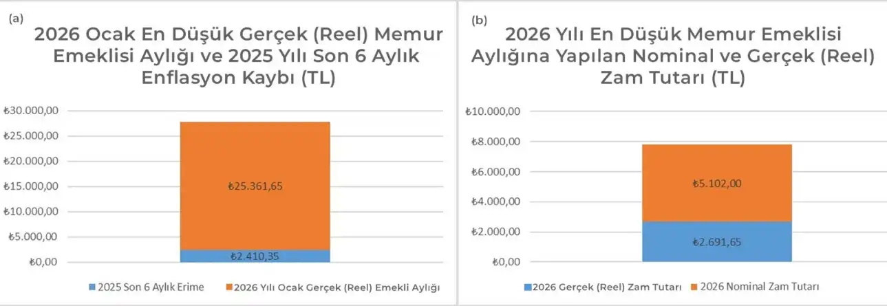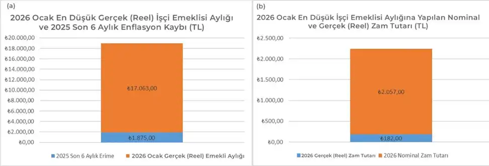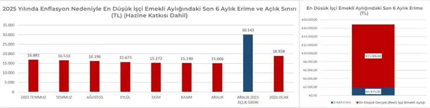 Ayrıca yapılan bu artış sanal bir artış. Çünkü aşağıdaki grafiklerden de görülebileceği gibi son 6 aylık (2025 Temmuz- Aralık) enflasyonu dikkate alındığında bu rakam gerçekte 25,362 TL’ye düşüyor.