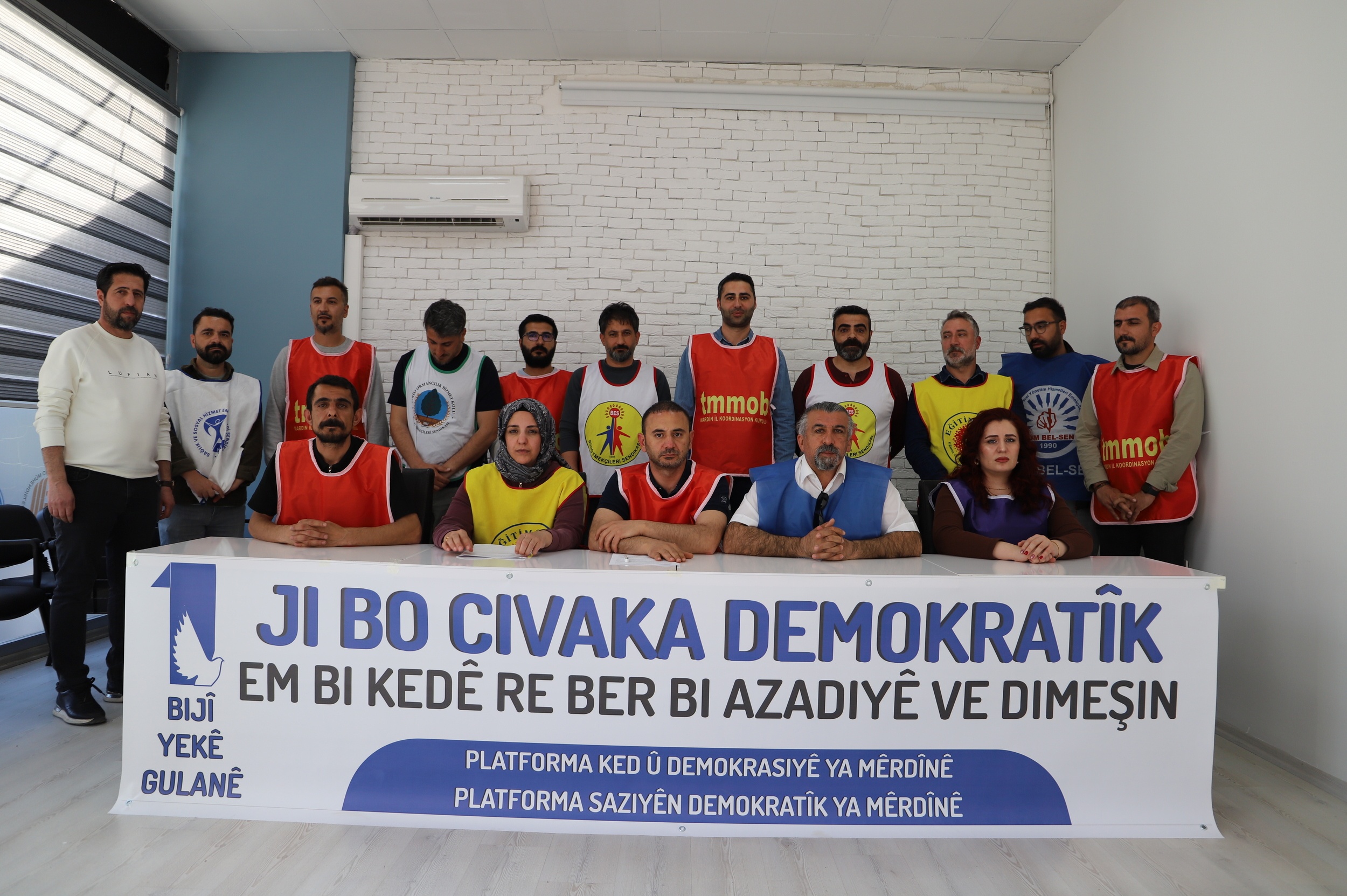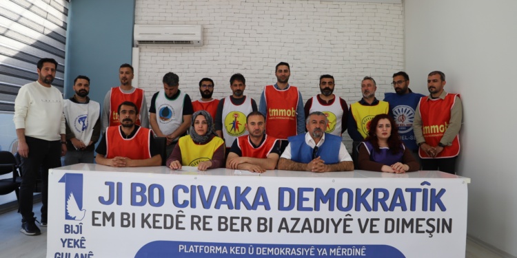 Mêrdîn Emek ve Demokrasi Platformu, 1 Mayıs İşçi Bayramı’na katılım çağrısında bulunmak amacıyla Mühendis ve Mimar Odaları Birliği (TMMOB) toplantı salonunda basın toplantısı düzenledi. Toplantının yapıldığı salona “Ji bo civaka demokratîk em bi kedê re ber bi azadiyê ve dimeşin” pankartı asıldı.