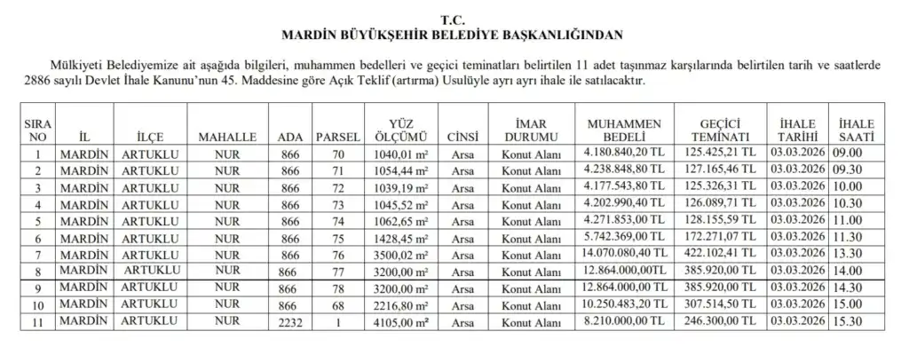 Kayyım yönetimindeki Mêrdîn Büyükşehir Belediyesi, Artuklu ilçesinde bulunan 11 taşınmazı satılığa çıkardı