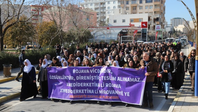 Suriye Geçici Hükümetine bağlı paramiliter grupların Halep ile Kuzey ve Doğu Suriye’ye yönelik saldırıları Mêrdîn’in Artûklû (Artuklu) ilçesinde Demokratik Kurumlar Platformu tarafından düzenlenen yürüyüşle protesto edildi.