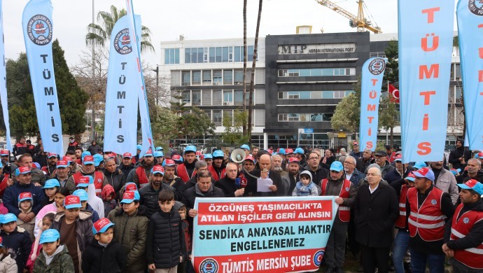 Tüm Taşıma İşçileri Sendikası (TÜMTİS) Mersin Şubesi, Mersin Limanı’nda yükleme ve boşaltma işlerinde çalışan 180’den fazla işçinin taşeron firma Özgüneş Taşımacılık tarafından işten çıkarılması protesto edildi.