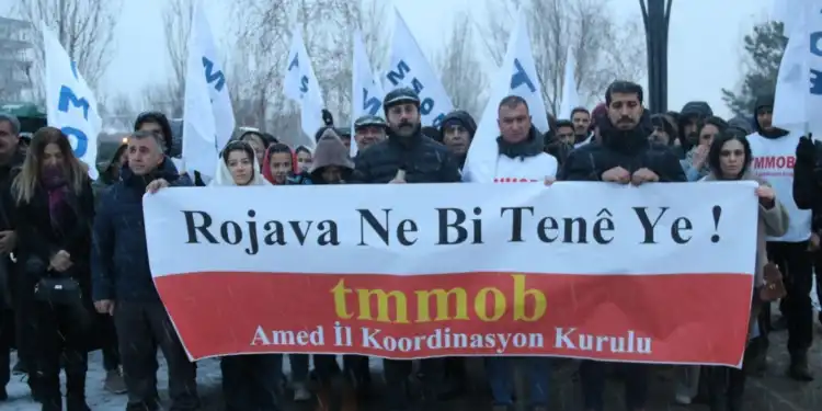 Türk Mühendisler ve Mimarlar Odası (TMMOB) Amed İl Koordinasyon Kurulu (İKK), HTŞ, DAİŞ ve Türkiye’nin desteklediği paramiliter grupların Rojava’ya dönük saldırılarına ilişkin açıklama yaptı. Peyas (Kayapınar) ilçesi Rojava Parkı’nda yapılan açıklamada “Rojava ne bi tenê ye” pankartı açıldı. Açıklamayı yapan Mimarlar Odası Amed Şubesi Eşbaşkanı Derman Üngür, “Emperyalist güçlerin çıkar hesapları, bölgesel diktatörlüklerin kirli ittifakları ve Türkiye’nin doğrudan/dolaylı desteğiyle Rojava yeniden yıkım alanına çevrilmek istenmektedir. Karanlık, kölelik, şiddet ve sömürüyü temsil eden bu yapılara meşruiyet tanıyan, lojistik ve siyasi destek veren, sessiz kalan herkes; işlenen insanlık suçlarının ortağıdır” dedi.