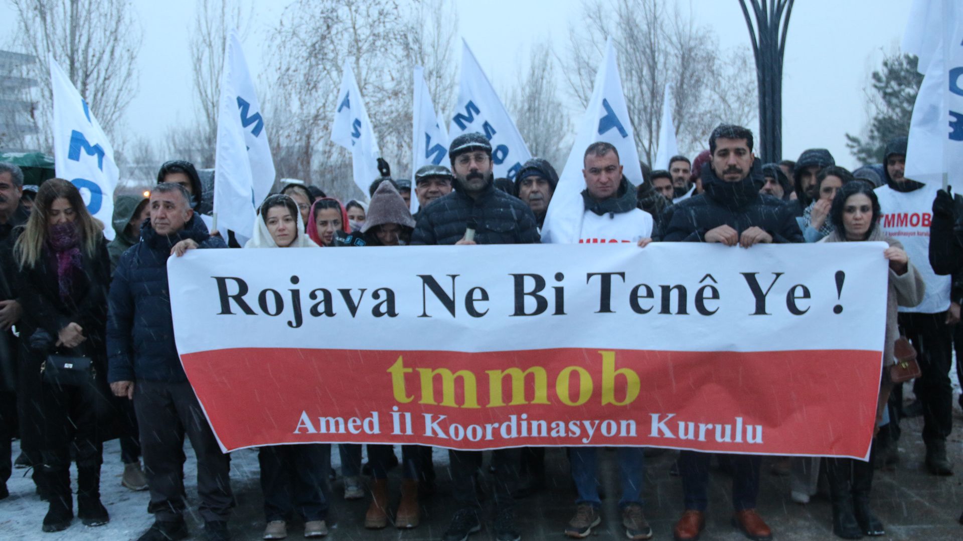 Türk Mühendisler ve Mimarlar Odası (TMMOB) Amed İl Koordinasyon Kurulu (İKK), HTŞ, DAİŞ ve Türkiye’nin desteklediği paramiliter grupların Rojava’ya dönük saldırılarına ilişkin açıklama yaptı. Peyas (Kayapınar) ilçesi Rojava Parkı’nda yapılan açıklamada “Rojava ne bi tenê ye” pankartı açıldı. Açıklamayı yapan Mimarlar Odası Amed Şubesi Eşbaşkanı Derman Üngür, “Emperyalist güçlerin çıkar hesapları, bölgesel diktatörlüklerin kirli ittifakları ve Türkiye’nin doğrudan/dolaylı desteğiyle Rojava yeniden yıkım alanına çevrilmek istenmektedir. Karanlık, kölelik, şiddet ve sömürüyü temsil eden bu yapılara meşruiyet tanıyan, lojistik ve siyasi destek veren, sessiz kalan herkes; işlenen insanlık suçlarının ortağıdır” dedi.