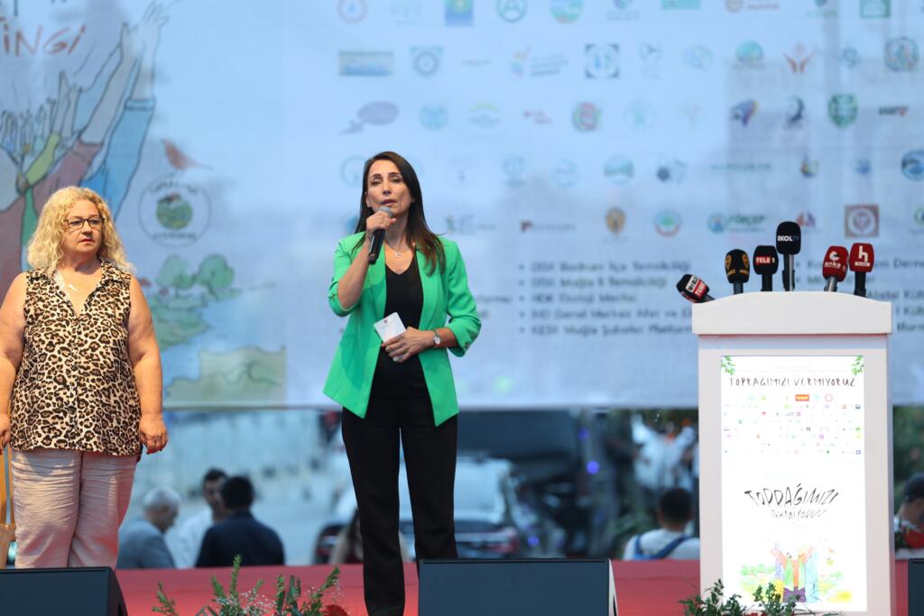 Muğla’da çeşitli siyasi parti ve demokratik kitle örgütü, ‘Toprağımızı vermiyoruz’ şiarıyla miting düzenledi. Binlerin katıldığı mitingde konuşan DEM Parti Eş Genel Başkanı Tülay Hatimoğulları, Barış ve Demokratik Toplum Çağrısı’na dikkat çekerek ‘Barış, bu yeryüzünde canlı cansız bütün varlıkların yaşam hakkını savunmak demektir’ dedi