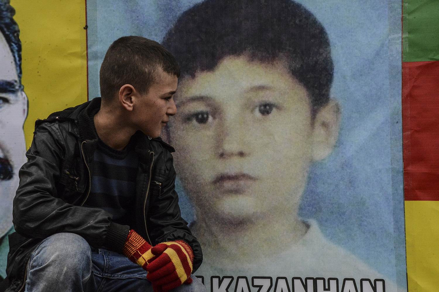 Kurds pose with pictures A friend of 12-year-old boy Nihat Kazanhan (R), who was allegedly shot dead by police in the Cizre district of Sirnak on January 14, mourns on January 15, 2015 in Sirnak. Prime Minister Prime Minister Ahmet Davutogu and the interior minister have denied any police involvement regarding the death of the child.     AFP PHOTO / ILYAS AKENGIN