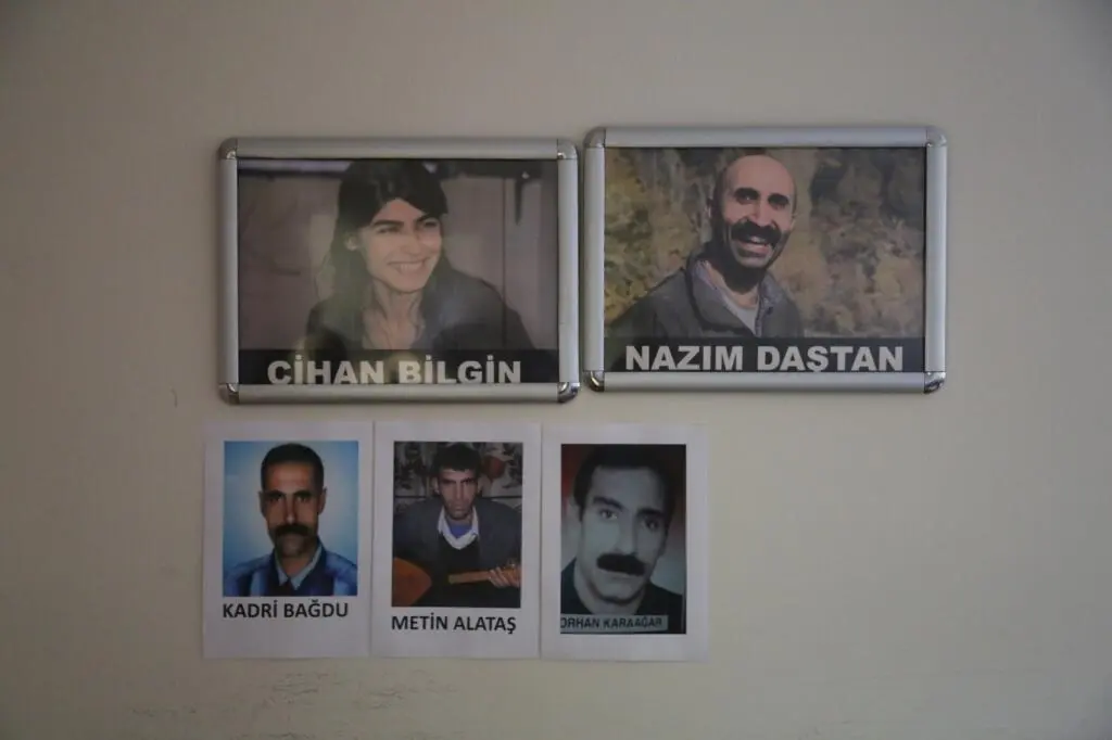 Yine duvarlarda bir yıl önce Rojava’da katledilen gazeteci Nazım Daştan ve Cihan Bilgin’in gülümseyen yüzleri sizi selamlıyor. Duvarlarda başta Apê Musa ve Gurbetelli Ersöz olmak üzere birçok basın şehidinin fotoğrafları yer alıyor.