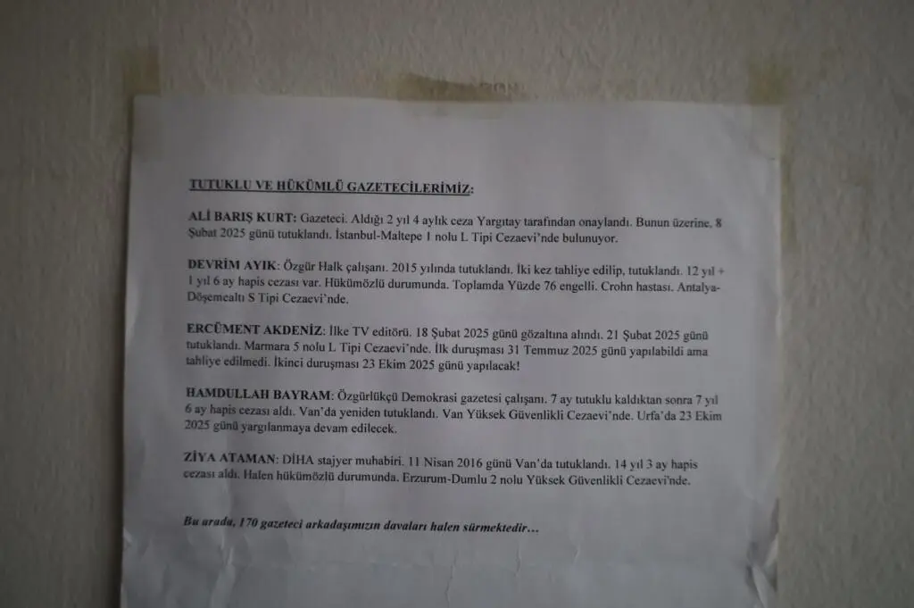 Ajansın bürosundaki panoda yılın önemli günlerinin yer aldığı bir belge asılı duruyor. Bu da işini ne kadar titizlikle yaptığını gösteriyor. Bir diğer duvarda ise tutuklu gazetecilerin bulunduğu bir liste var. Listede hangi gazeteci nerede tutuklu, mahkeme tarihi, her gün güncellenerek listelenmiş. Listenin en altında şu not dikkatimi çekiyor; “Bu arada, 170 gazeteci arkadaşımızın davaları halen sürmektedir…”