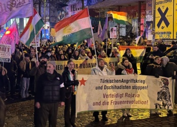Hamburg Kürt Halk Meclisi öncülüğünde binlerce kişi, HTŞ-DAİŞ ve Türkiye güdümündeki çetelerin Rojava ve Kuzey Doğu Suriye’ye yönelik saldırılarını protesto...