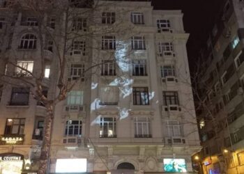 Agos gazetesi Genel Yayın Yönetmeni Hrant Dink'in katledilişinin 16. yılında Agos gazetesinin eski adresi olan Sebat Apartmanı'na Dink'in silüeti ve...
