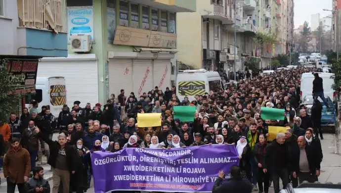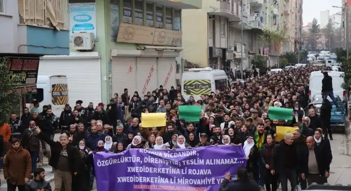 Suriye Geçici Hükümeti’ne bağlı silahlı grupların Halep’te Kürt mahalleleri olan Sêxmaqsûd ile Eşrefiyê mahallelerine dönük saldırıları, Mêrdîn’in Qoser (Kızıltepe) ilçesinde binlerce kişi tarafından düzenlenen yürüyüşle protesto edildi. Kuzey ve Doğu Suriye’ye destekleyen döviz ve pankartlar taşıyarak Özgürlük Meydanı’nda bir araya gelen binlerce kişi, buradan Mehmet Sincar Parkı’nda doğru yürüyüşe geçti. Yürüyüşte, sık sık “Bijî berxwadana Rojava”, “Bijî Serok Apo”, “Rojava, Rojhiat Kürdistan yek welat”, “Bijî berxwedana gele Kurd” ve “Jin jiyan azadî” sloganlarını attı. “Çerxe Şoreşê” marşının hep bir ağızdan söylendiği yürüyüşte, gençler havai fişekler Halep’teki direnişe destek verdi. Polisin gözaltına alma girişimleri kitle tarafından engellendiği yürüyüşün sonlandığı Mehmet Sincar Parkı’na açıklama yapıldı.