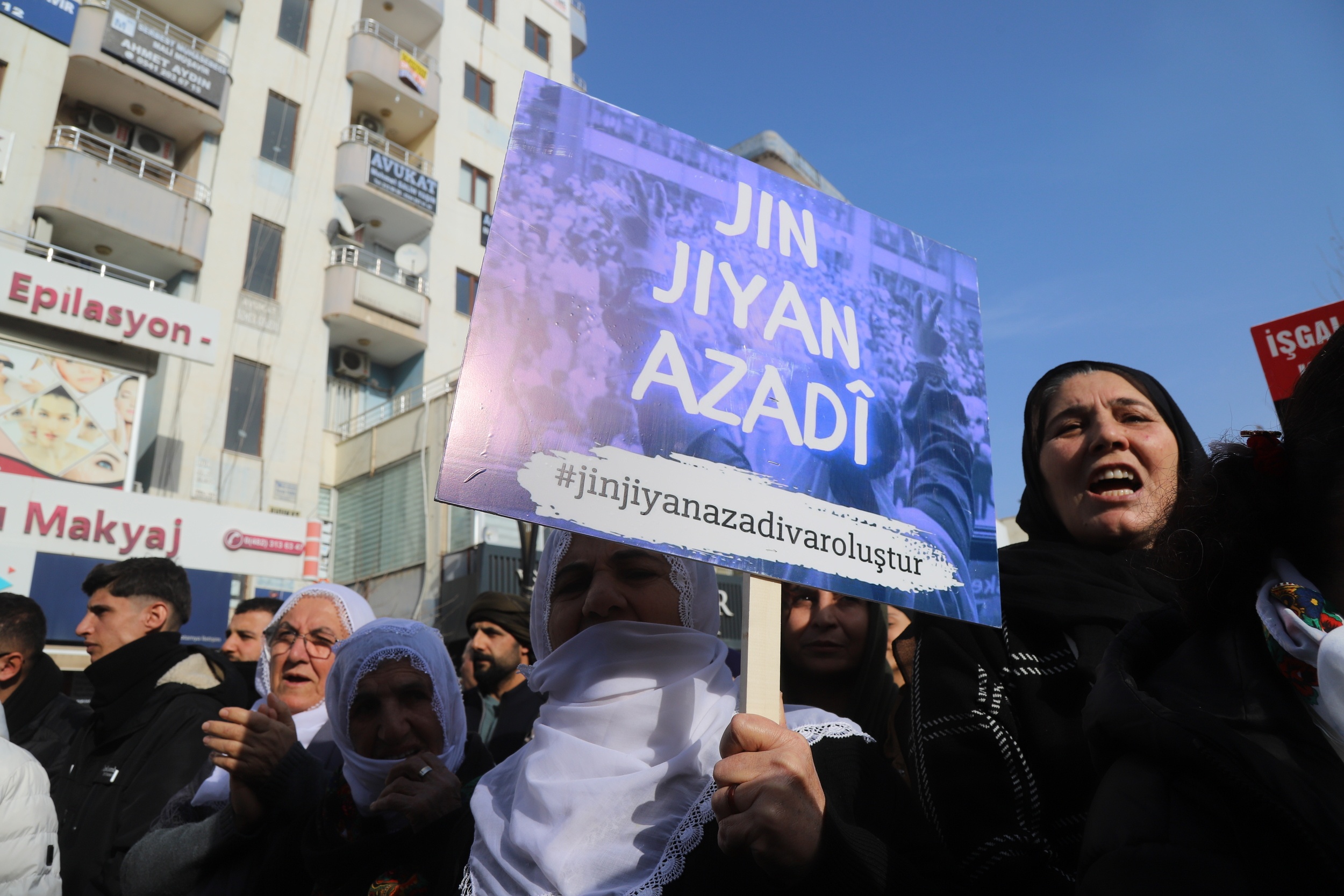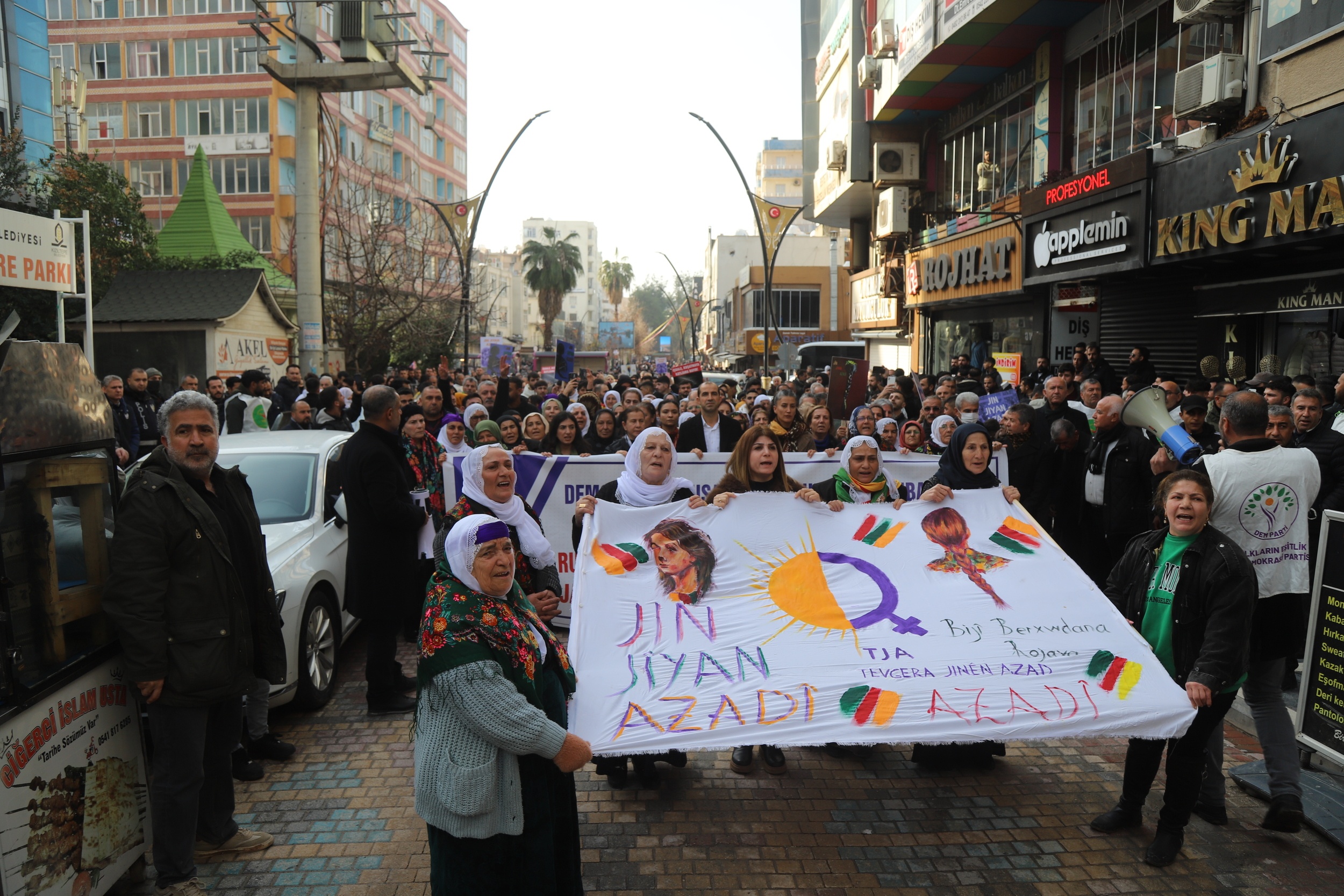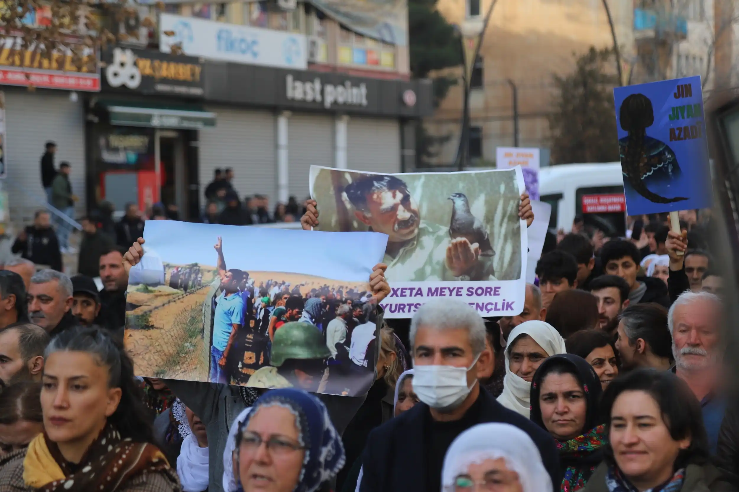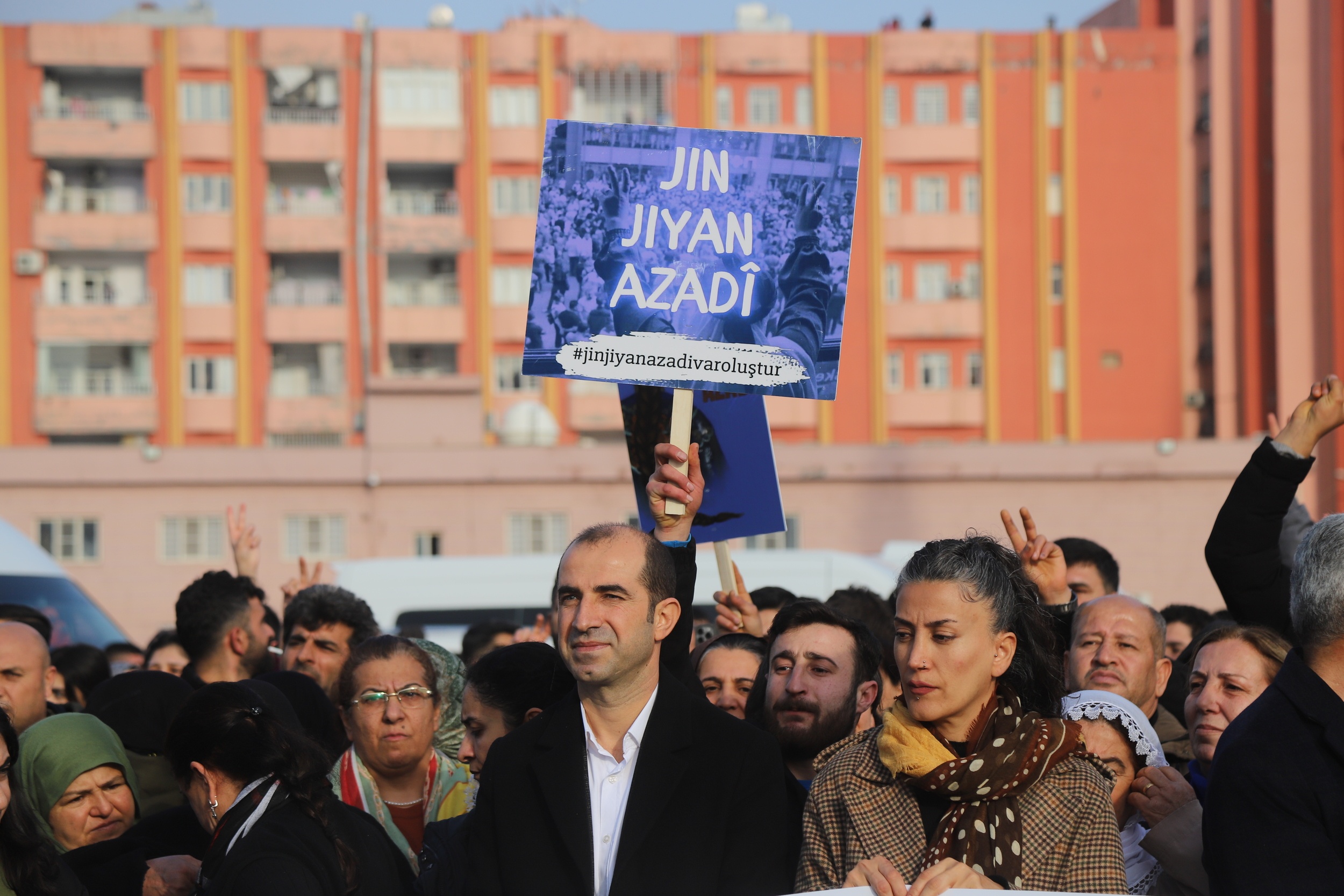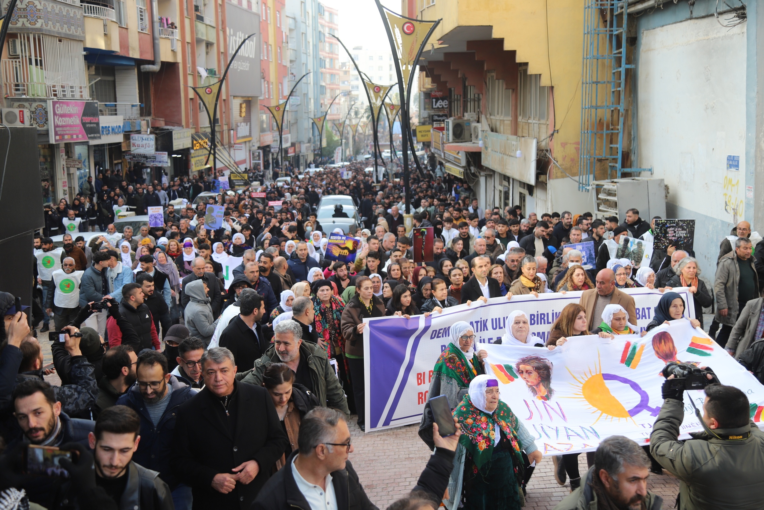 Demokratik Bölgeler Partisi (DBP) Eş Genel Başkanı Keskin Bayındır’ın da katıldığı yürüyüşte, Kürt Halk Önderi Abdullah Öcalan’ın posterleri ile DSG savaşçıları ile YPJ savaşçılarını simgeleyen fotoğraflar taşındı. Abdullah Öcalan’ın posterinin açıldığı anlarda kitlenin coşkusu artarken, hep bir ağızdan “Be Serok jiyan na be” ve “Bijî Serok Apo” sloganları yükseldi. Yürüyüş, Kilise Caddesi ve Hastane Caddesi boyunca devam ederken, kitle Newroz alanına ulaştı. Newroz alanında kitle sloganlar eşliğinde bekleyişini sürdürürken, ardından platform adına açıklama metni Kürtçe ve Türkçe okundu.