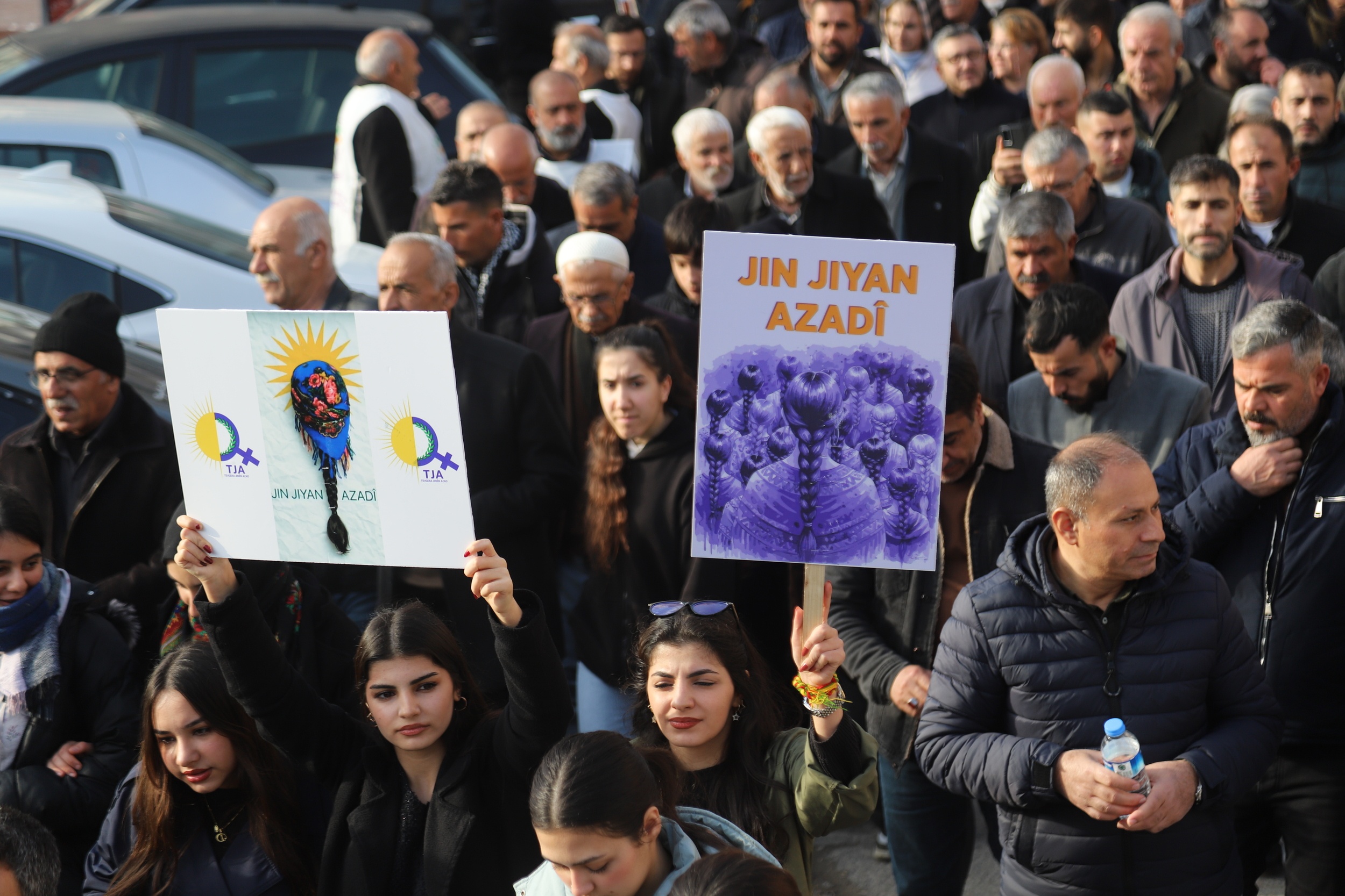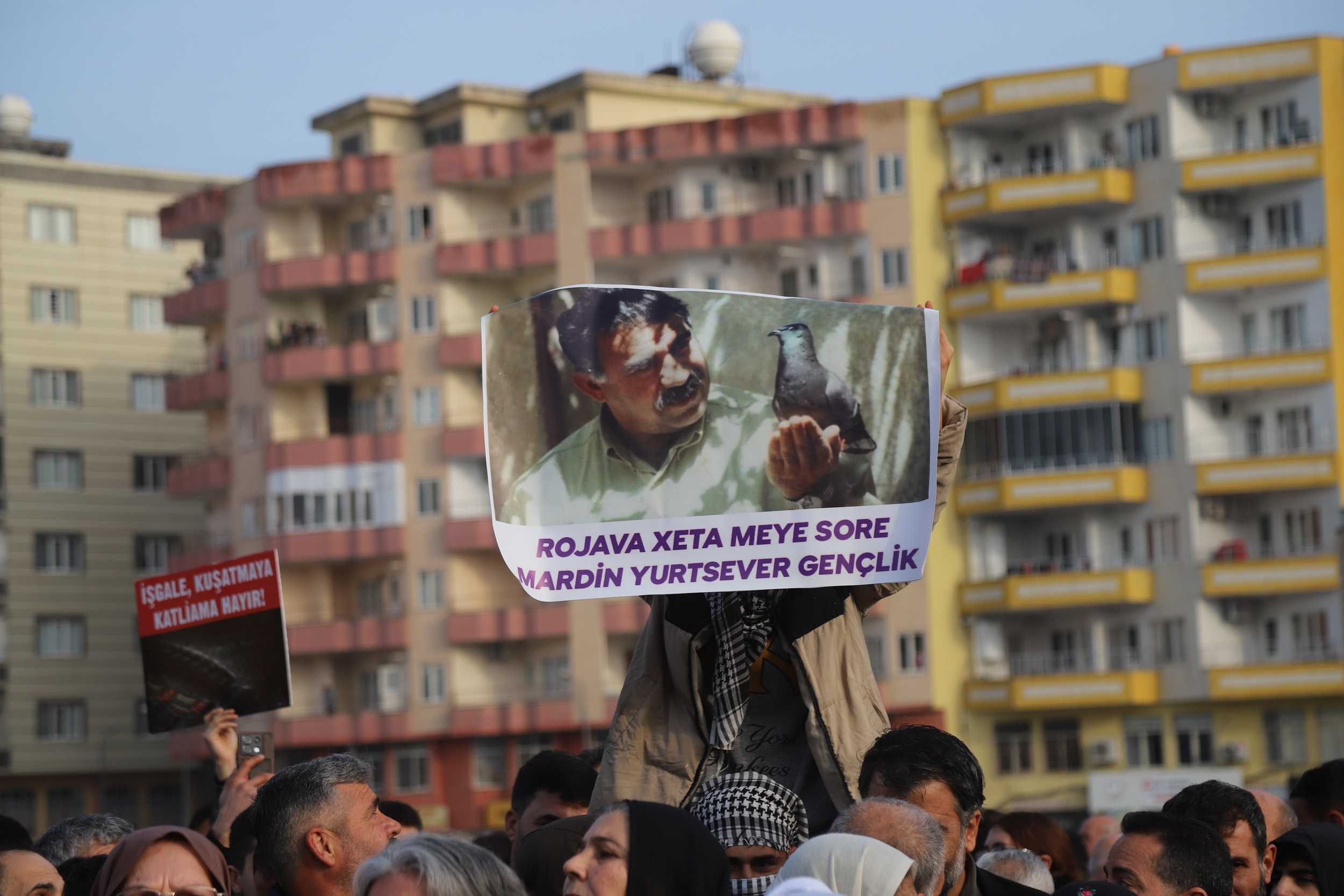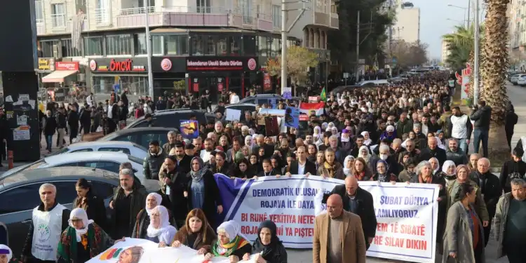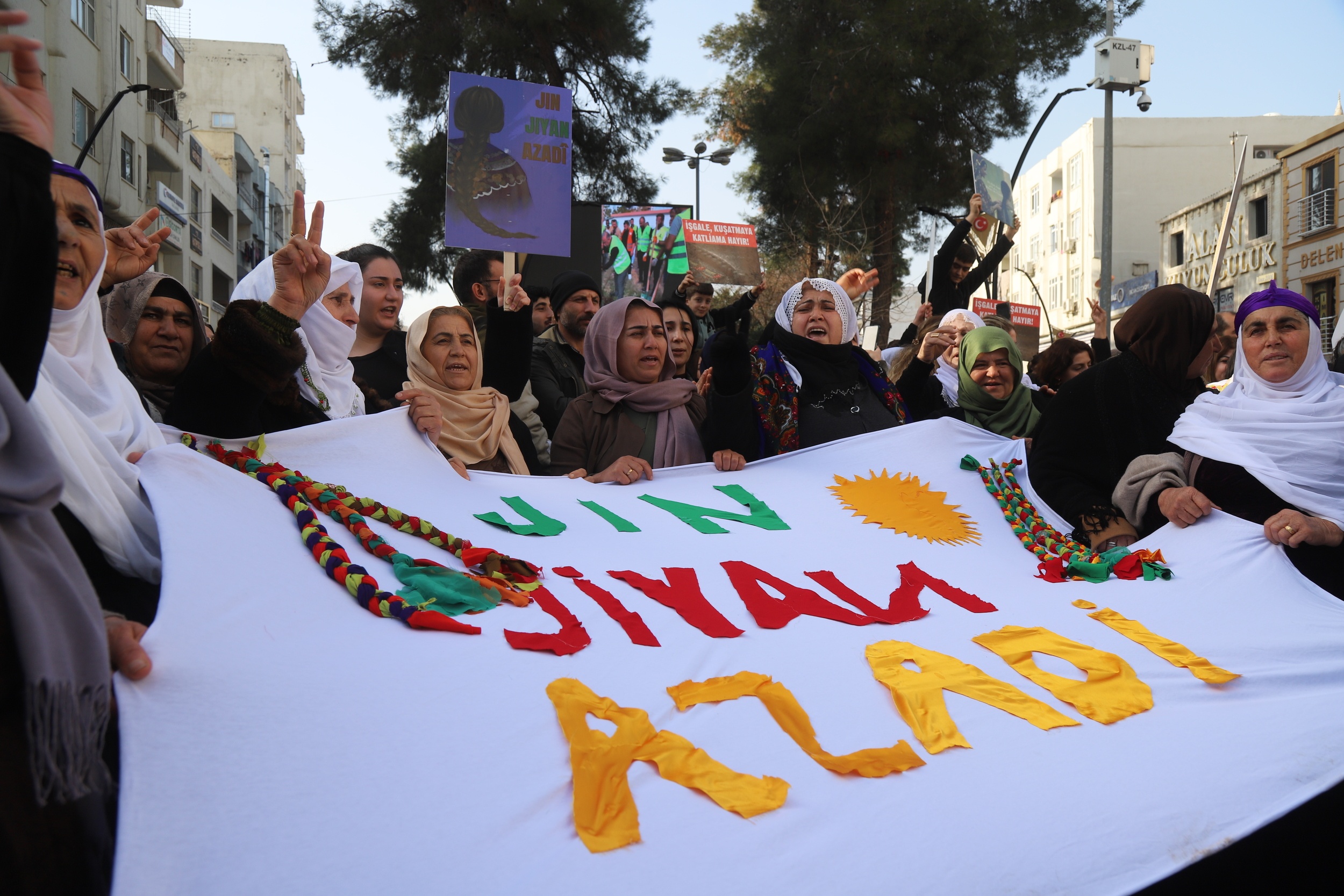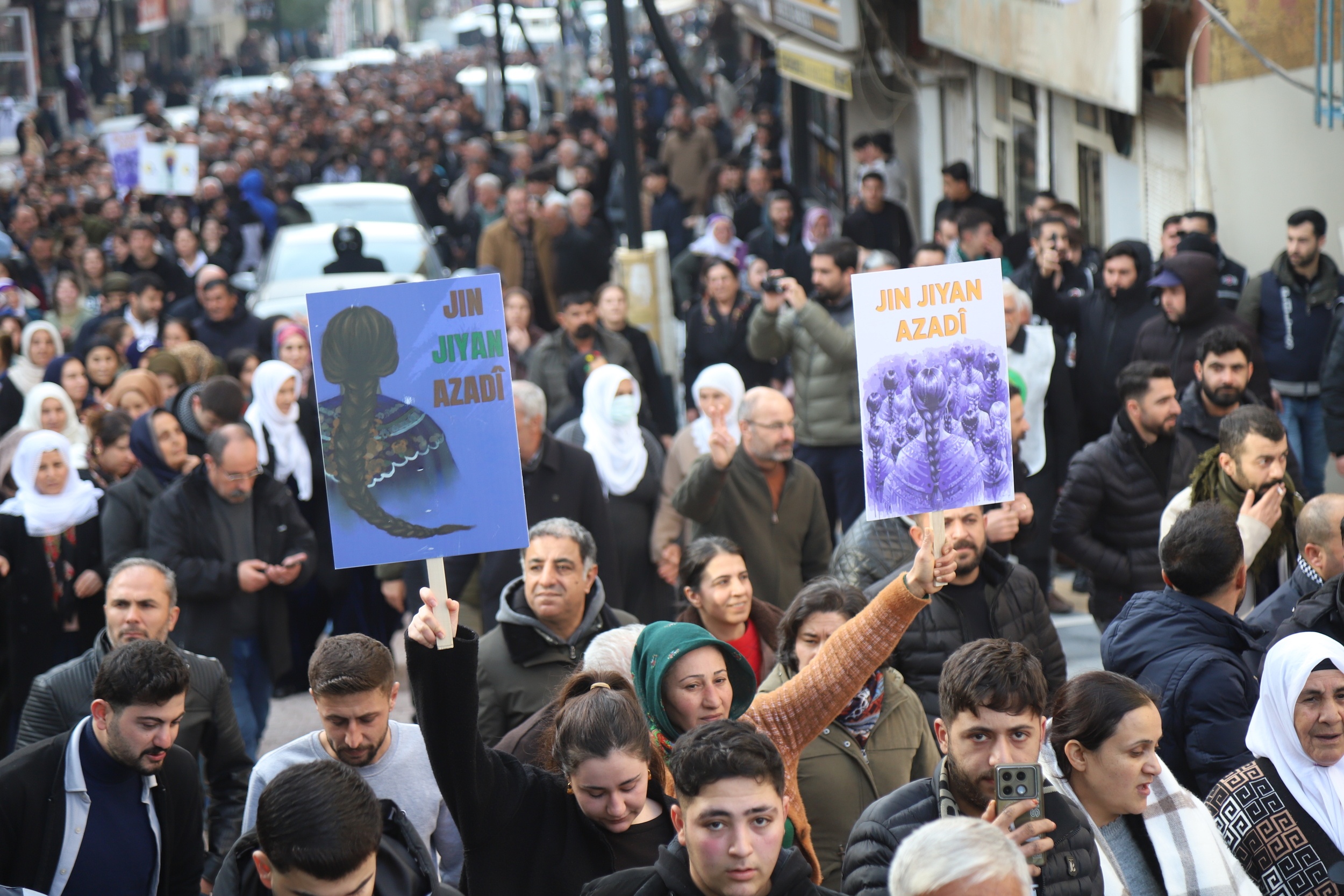 Mêrdîn’in Qoser (Kızıltepe) ilçesinde Demokratik Kurumlar Platformu’nun çağrısıyla on binlerce kişi Rojava ile Dayanışma Günü kapsamında Özgürlük Meydanı’nda bir araya geldi. Meydanda toplanan kitle, Rojava halkına seslerini duyurmak için sık sık “Bijî berxwedana Rojava”, “Rojava, Rojhilat e Kurdistan yek welat e”, “Rojava rumete rumetê gele Kurd”, “Bijî Serok Apo” “Yek e yek e, yek e. Gelê Kurd yek e! Kürdistan yek e!” ve “Bijî yekîtîya gelan” sloganları eşliğinde yürüyüşe geçti. Yürüyüş boyunca ellerinde Rojava’daki direnişi sahiplenen dövizler taşıyan on binler, “Jin, Jiyan, azadî” ve “Bi ruhê yekîtiya netewiya demokratîk em 1’ê Sibatê Roja cîhanî ya piştevaniya bi Rojava re silav dikim” pankartları arkasında yürüdü.