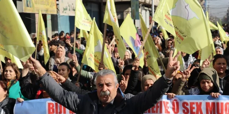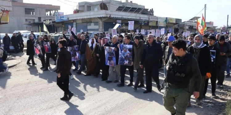 Til Koçer şehrinde yürüyüş, belediye yakınındaki kavşaktan başlayarak Halk Belediyesi Meydanı’na doğru ilerledi. Belediye binası önünde yürüyüş mitinge dönüştü.