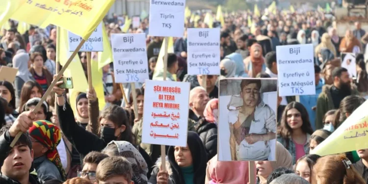 Qamişlo şehrinde yürüyüş, Sonî Kavşağı önünden 12 Mart Şehitleri Stadyumu’na kadar devam etti. Meydanlara akın eden binlerce sakin “Yaşasın Şêxmeqsûd ve Eşrefiyê Direnişi” sloganını yükseltti.