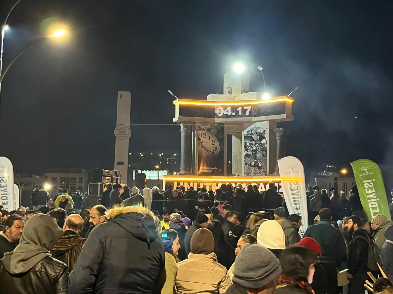 Hatay’ın Defne ilçesinde bulunan Uğur Mumcu Meydanı’nda yapılan anma etkinliğinin ardından saatler 04.17’si gösterildiğinde alanda bulunan kitle, saygı duruşunda bulundu. Kitle 04.17’de sirenlerin çalması ile 2 dakika boyunca o anda tekrardan o deprem anını yaşayarak, kaybettiklerini andı. Anma, Deprem Anıtı’na karanfil konması ile sona erdi.