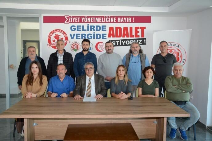 Adana Tabip Odası, SES ve Genel Sağlık-İş de, sağlık çalışanlarının artan vergi yüküne ve ücretlerdeki erimeye dikkat çekmek için “Vergide ve gelirde adalet” talebiyle Adana Tabip Odası’nda basın açıklaması yaptı. Basın açıklamasını okuyan Adana Tabip Odası Başkanı Uzm. Dr. Özden Polatöz, aile sağlığı merkezi çalışanlarından kesilen ve yüzde 35’e kadar çıkan vergi oranlarının adaletsizliğine dikkat çekerek, “Aile hekimliği çalışanları vergide adalet istiyor. Ücretlerimiz enflasyon karşısında eriyor, satın alma gücümüz düşüyor. Tüm ücretliler gibi yüksek oranda peşin vergi kesintileri ile yoksullaştırılıyoruz” dedi.