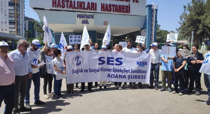 SES Adana Şubesi, sağlıkçıların çalışma koşullarına dikkat çekmek amacıyla Adana Dr. Ekrem Tok Ruh Sağlığı ve Hastalıkları Hastanesi önünde açıklama yaptı