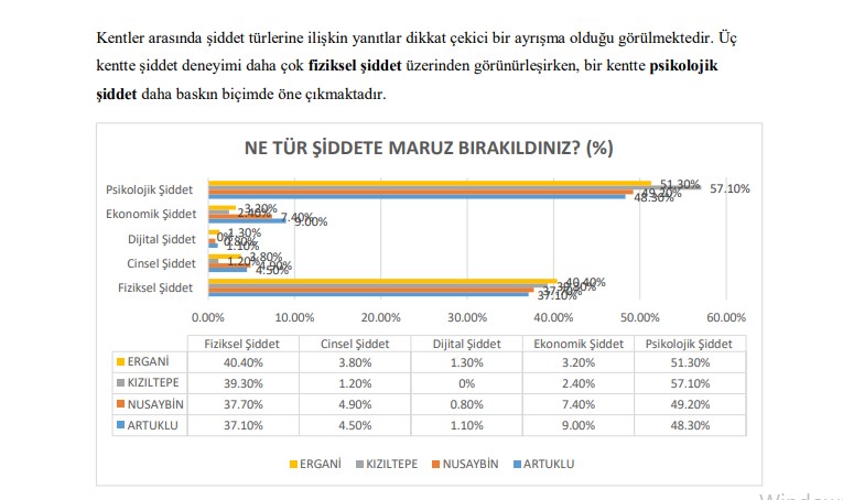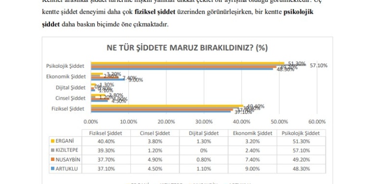 “Kadına yönelik şiddet denildiğinde aşağıdaki davranışlardan hangilerini şiddet olarak görüyorsunuz?” sorusuna kadınlar, fiziksel, psikolojik, cinsel ve dijital şiddet biçimlerinin büyük oranda şiddet olarak tanımladı. Nisêbîn’de haftada bir-iki kez şiddete maruz kaldığını belirtenlerin oranı yüzde 23,3, her gün şiddete maruz kaldığını belirtenlerin oranı ise yüzde 21,9, Artûklû’da da “her gün” ve “haftada bir-iki kez” yanıtını verenlerin oranı yüzde 19,7 olarak gözlemlendi. Buna karşın Qoser ve Erxenî’de şiddetin daha çok “ayda bir-iki kez” düzeyinde olduğu raporda yer aldı. Qoser’de bu oran yüzde 31,0 iken, Erxenî’de yüzde 27,9 oldu. Şiddetin en çok hangi ortamlarda yaşandığına ilişkin yanıtlar değerlendirildiğinde, dört ilçede de şiddetin evlerinde gerçekleştiği görüldü. “Kendi evinde” yanıtını veren kadıların oranı Nisêbîn’de yüzde 76,5, Artûklû’da yüzde 79,7, Qoser’de yüzde 83,3, Erxenî’de ise yüzde 73,0 oranlarıyla her ilçede ilk sırada yer aldı.