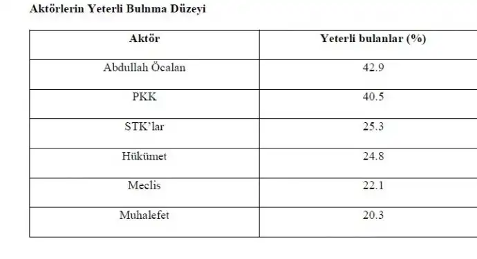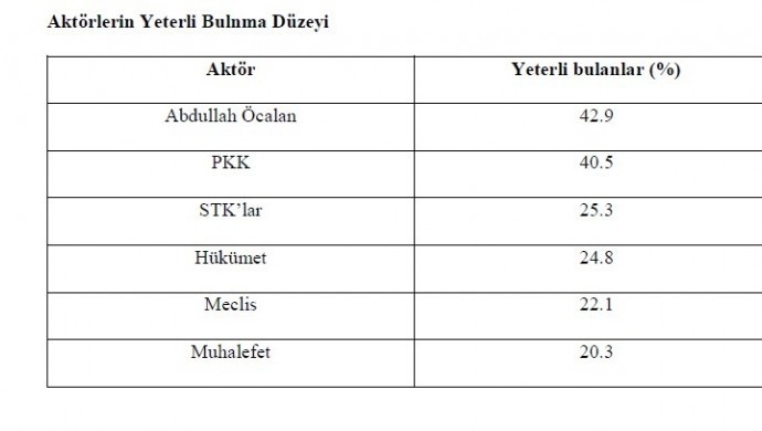 “Aktörlerin Yeterli Bulunma Düzeyi” konusundaki soruya ise “Abdullah Öcalan 42,9”, “PKK” yüzde 40,5, STK’lar 25,3, “hükümet” 24,8, Meclis 22,1, muhalefet 20,3 ile yer aldı. Araştırmada bu sonuçlar, “Barış inşası literatüründe vurgulanan çok aktörlü barış süreci yaklaşımını da desteklemektedir. Siyasi aktörler, sivil toplum ve çatışmanın doğrudan tarafları farklı roller üstlenmekte ve her bir aktörün sürece yönelik yaklaşımı toplum tarafından ayrı ayrı değerlendirilmektedir. Araştırma bulguları, siyasi kurumlara yönelik yeterlilik algısının görece düşük olmasının, toplumun barış sürecinde daha aktif ve somut rol üstlenen aktörler görme beklentisiyle ilişkili olabileceğini göstermektedir. Bu durum, barış sürecinin toplumsal meşruiyetinin güçlenmesi açısından siyasi aktörlerin rolünün kritik önem taşıdığını ortaya koymaktadır” diye değerlendirildi.