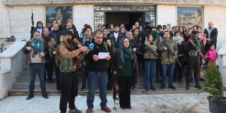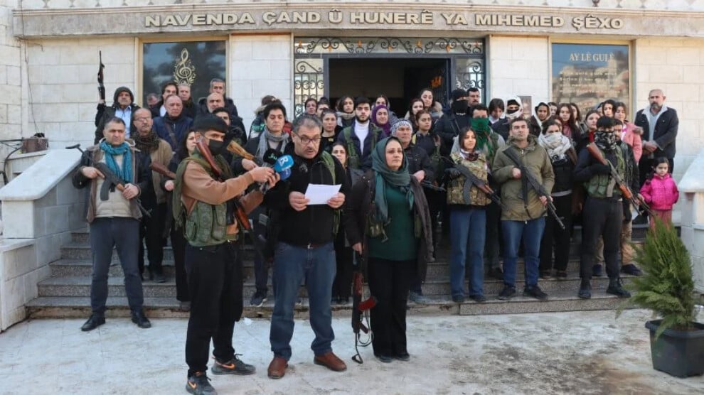Açıklama, Qamişlo’daki Mihemed Şêxo Kültür ve Sanat Merkezi önünde, sanatçılar, aydınlar, yazarlar ve şairlerin yanı sıra Cizir Kantonu Demokratik Özerk Yönetimi Yürütme Meclisi temsilcilerinin katılımıyla yapıldı. Açıklamayı TEV-ÇAND Eşbaşkanı Xelîl Tehlo okudu.
