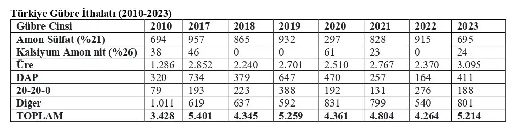 Türkiye’nin 2023 yılında yaptığı gübre ithalatı 2010 yılına göre %52,1 oranında artarak 3,428 milyon tondan 5,2 milyon tona, 2025 yılında 6 milyon tona ulaşmıştır.