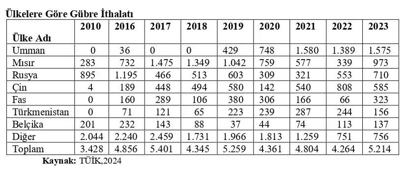 Türkiye sentetik gübre ihtiyacını karşılamak için pek çok ülkeden ithalat yapmaktadır.