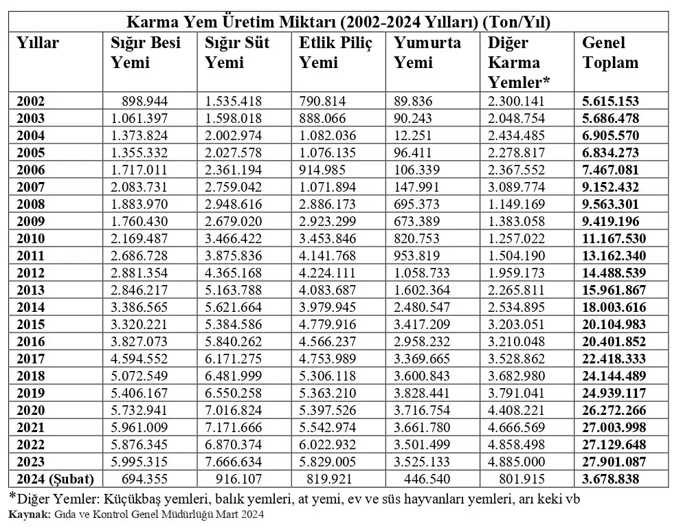 Türkiye karma yem sanayisinin 2024 yılı üretimi 29,4 milyon ton olarak gerçekleşmişti. 2025 yılı itibarı ile karma yem üretimi 30,6 milyon tona ulaştı. 24 yılda karma yem miktarı yaklaşık 6 kat arttı. Artış oranında mera-doğal hayvancılıktan uzaklaşıldı.