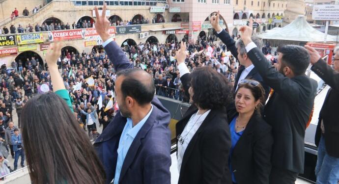 AKP-MHP’nin açıkladığı beyannamesine de dikkat çeken Uçar, “Sloganı ‘Doğru zaman doğru adam’ biz bu adamı depremden kurtarılamayan hayatlardan tanıyoruz. Kadın cinayetlerinden tanıyoruz. Talan edilen doğamızdan tanıyoruz. Kürdistandaki savaş politikalarından tanıyoruz. Bizim sloganımız nedir “Disa em” yine biz. Yani hepimiz farkımız buradan. Biz bu adama sandıkta hayır diyeceğiz. Ama zaman doğru zaman tek adam rejimini göndermek için en doğru zamandayız. Yeni ve demokratik bir Türkiye’yi kurmak için en doğru zamandayız. Yolumuz açık engelimiz yok. Bu seçimi kazanan biz olacağız. En büyük ittifakımız sizlersiniz”