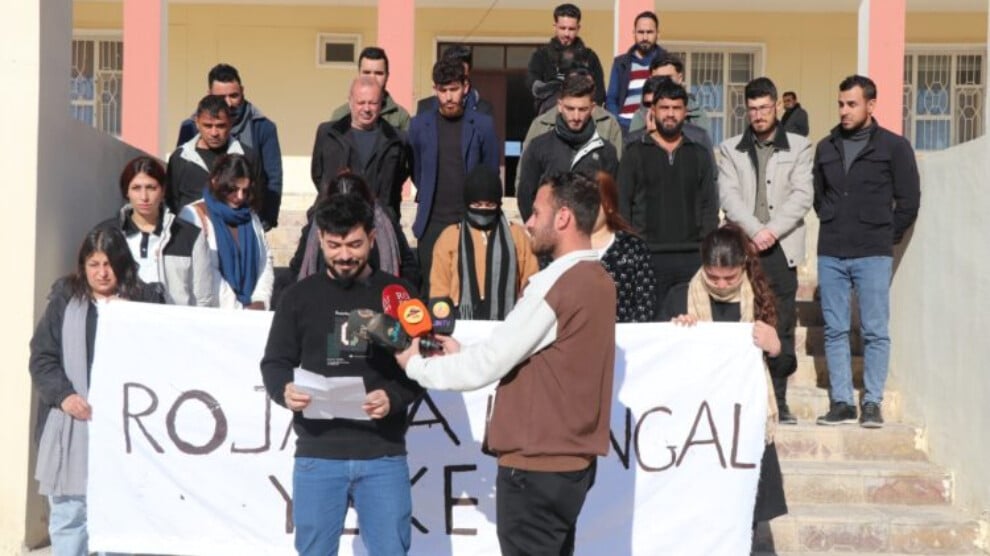 Şengal Özerk Yönetimi’ne bağlı Şengal Dil ve Eğitim Kurumu’nun öğretmenleri, Şengal merkezdeki Zarîfe Osê Okulu önünde basın açıklaması yaptı.