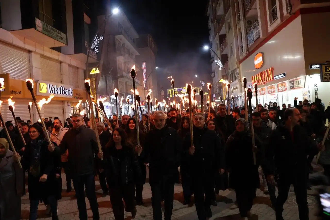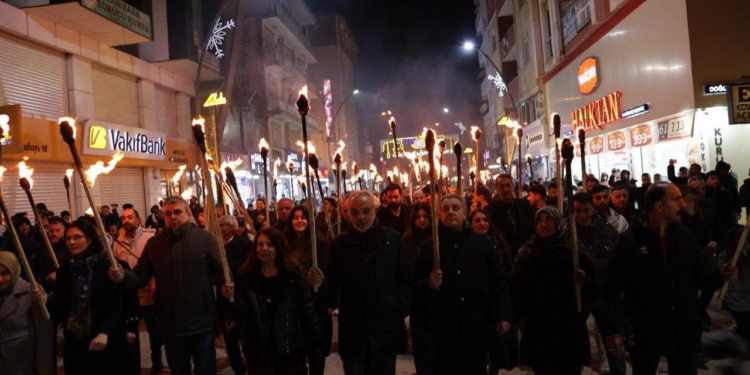 Halkların Eşitlik ve Demokrasi Partisi (DEM Parti) Bazîd (Doğubeyazıt) ilçe binası önünde bir araya gelen kitle, ellerinde 77 meşale ile Mem û Zîn Caddesi’nden Belediye Parkı’na kadar meşaleli yürüyüş gerçekleştirdi. Kürt Halk Önderi Abdullah Öcalan’ın 4 Nisan’da 77 yaşına girecek olması dolayısıyla 77 meşale taşıyan kitle, yürüyüş boyunca sık sık “Bijî Serok Apo” ve “Bê Serok jiyan nabe” sloganları attı.