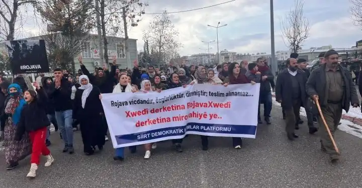 Sêrt’te (Siirt) Demokratik Kurumlar Platformu tarafından, Kuzey ve Doğu Suriye’ye yönelik saldırılara karşı DEM Sêrt Parti il binasında bir araya kitle polisin biber gazı ve tazyikli su ile saldırılara rağmen binlerce kişi yürüyüşe geçti. Çakmaklı ve Sevgi mahallelerine doğru saatler süren bir yürüyüş gerçekleştirdi. Yürüyüşte sık sık “Bijî berxwedana Rojava”, “Bijî Serok Apo”, “Rojava Rojhilat Kurdistan yek welat e”, “Her yer Rojava her yer berxwedan” “Rojava rûmetame ye” “Bijî bexwedana QSD” sloganları atarak DEM Parti il binası önüne gelerek açıklama gerçekleştirdi.