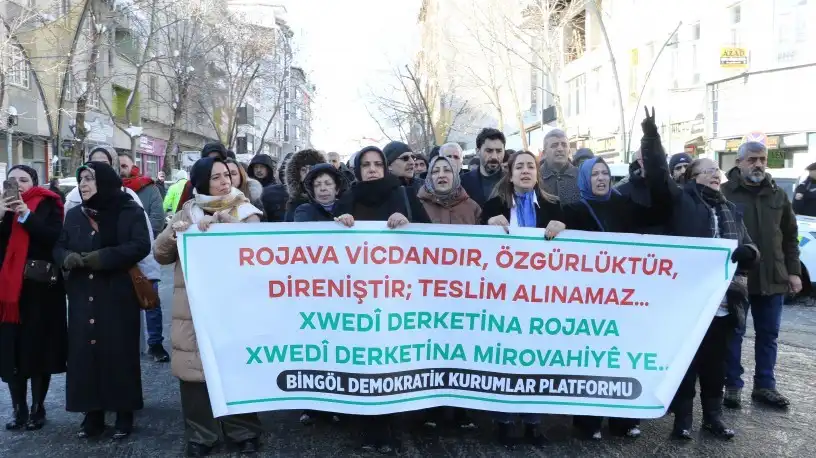 Çêwlig (Bingöl) Demokratik Kurumlar Platformu öncülüğünde Kuzey ve Doğu Suriye’ye dönük saldırılara karşı yürüyüş düzenlendi. “Rojava vicdandır, özgürlüktür, direniştir; teslim alınamaz” yazılı pankartla Hacıhıdır Camii önünde başlayan yürüyüş, Kent Meydanı’na kadar sürdü. Yürüyüş boyunca kitle sık sık “Bijî berxwedana Rojava” ve “Kürdistan faşizme mezar olacak” sloganları attı.