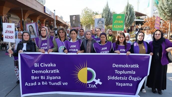 25 Kasım’a kadar yapılacak etkinliklerin aktarılmasından sonra kadınlar,  Veysel Karani Belediyesi’ne kadar yürüyüş gerçekleştirdi. Yürüyüş boyunca, “Jin, jiyan, azadî”, “Biji berxedana jina” ve  “Kadın yaşam özgürlük” sloganları atıldı.