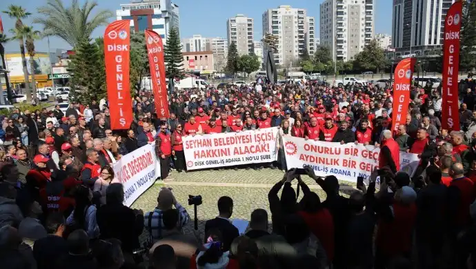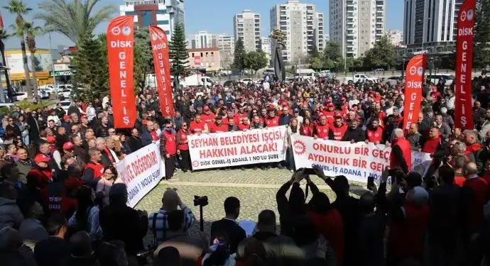 Adana’da Seyhan Belediyesi’nin kadrolu işçileri ve belediye şirketi Seyhan İmar A.Ş. işçileri toplu iş sözleşmesi, görüşmelerinde 2026 yılı için idare tarafından teklif edilen yüzde 3’lük zammı kabul etmeyerek, eylem yaptı.