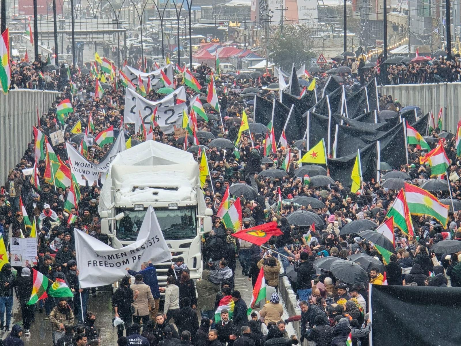 Soğuk ve karlı havaya rağmen, Silêmani’de Rojava’daki seferberliğe destek amacıyla düzenlenen yürüyüşe on binlerce kişi katıldı.