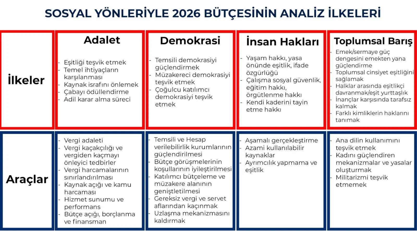 ‘Demokratik Kamu Maliyesi Yaklaşımı’ altında bütçe/maliye politikalarının üç işlevinden sırasıyla; “yeniden bölüşüm işlevine” uygun olarak, vergiler mükelleflerinin gerçek anlamda ödeme gücüne göre alınmalıdır. Vergi sistemi yeterli kaynağı sosyal ihtiyaçlar için harekete geçirirken, yoksulluğu ve eşitsizlikleri azaltmaya yardımcı olmalı, kamu harcamaları herkes için gerekli olan ‘yaşamın temel ekonomisini’ ve bunun araçlarını sunmalıdır.