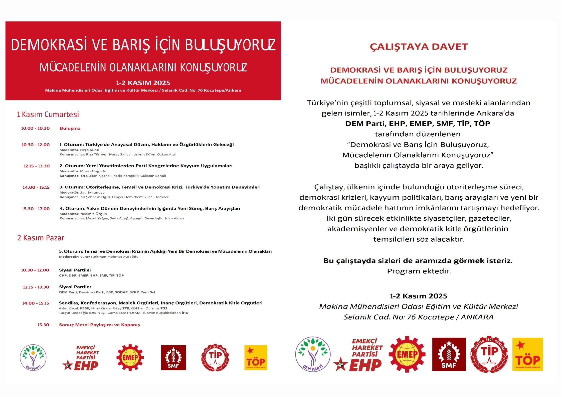 Halkların Eşitlik ve Demokrasi Partisi (DEM Parti), Emekçi Hareket Partisi (EHP), Toplumsal Özgürlük Partisi (TÖP), Emek Partisi (EMEP), Türkiye İşçi Partisi (TİP) ve Sosyalist Meclisler Federasyonu (SMF) “Demokrasi ve barış için buluşuyoruz, mücadelenin olanaklarını konuşuyoruz” şiarı ile 2 gün sürecek bir çalıştay düzenleyecek. Türkiye’de yaşanan demokrasi krizleri, yönetim deneyimleri ve mücadele yöntemlerinin konuşulacağı çalıştay, 1 ve 2 Kasım tarihlerinde düzenlenecek. Birçok konuşmacının olduğu çalıştay, Ankara Makina Mühendisleri Odası (MMO) Eşitim ve Kültür Merkezi’nde düzenlenecek.