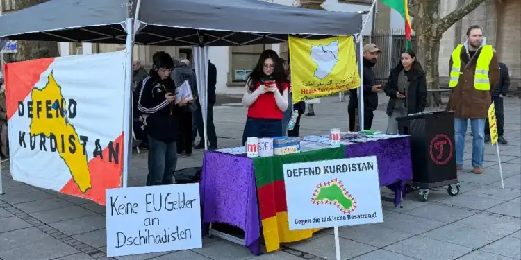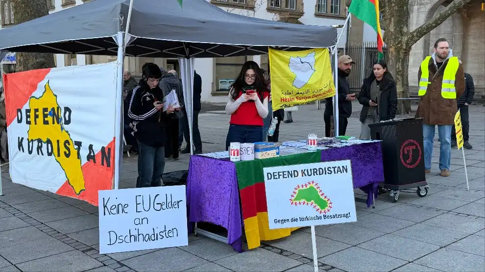 Almanya’nın Stuttgart kentinde HTŞ ve Türkiye güdümündeki çetelerin Rojava’ya yönelik saldırı ve katliamlarını protesto etmek ve Rojava ile dayanışmak amacıyla çadır kuruldu.