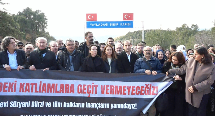 Çukurova Emek ve Demokrasi Güçleri, Suriye’de yaşanan katliamlara karşı Hatay’ın Yayladağı ilçesinde basın açıklaması yapılıyor. Açıklamaya DEM Parti Eş Genel Başkanı Tülay Hatimoğulları da katıldı.