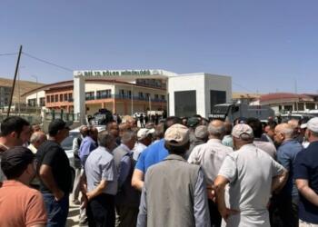 Wan’ın Artemêt ilçesinde yaşayan yurttaşlar, Şamran Kanalı’na su verilmemesi nedeniyle bahçelerinin kuruduğunu söyleyerek kuruyan meyveleri DSİ binası önüne döktü Wan’ın Artemêt ...