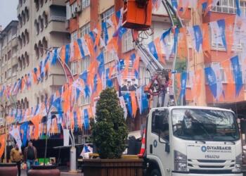 Kayyım yönetimindeki Amed Büyükşehir Belediyesi’ne ait vinç ile AKP’nin seçim propaganda bayrakları asıldı 31 Mart yerel seçimlerine 38 gün kalırken, ...