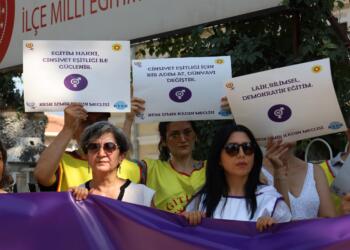 KESK İzmir Kadın Meclisi, Eğitim Sen üyesi öğretmenlerin 8 Mart’ta ‘Toplumsal cinsiyet eşitliği dersi’ne girmesinden kaynaklı kınama cezası almasını protesto ...