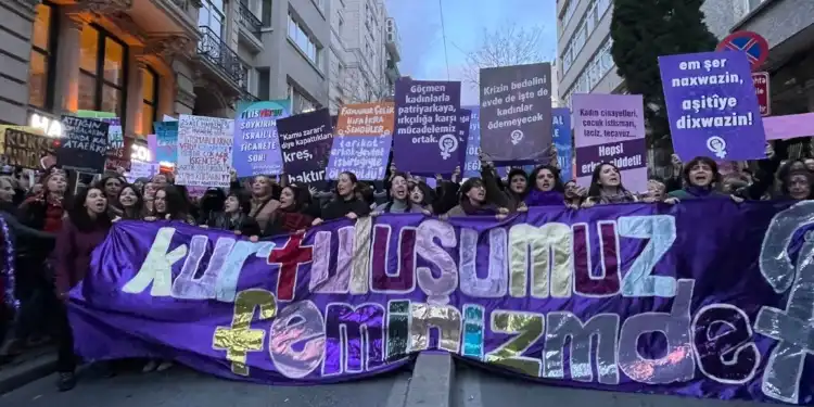 “Yanı başımızda İran’a ABD ve İsrail füzeleri düşerken Türkiye, NATO üslerini kullanıma açarak bu suça ortak oluyor. Bu savaşı ‘kadınları özgürleştirme’ adına meşrulaştırmaya çalışan İsrail’in hapishanelerinde Filistinli kadınlar işkence görüyor. Suriye’de ABD desteğiyle iktidarda olan HTŞ, Alevi, Kürt, Arap, Dürzi kadınları öldürüyor. Epstein dosyalarını ve kendi suç ortaklığını örtmek için elinden geleni yapan Trump, ancak düşmanını bombalamak için işlevli olduğunda kadınların özgürlüğünü aklına getiriyor. Biz bu yalanı Irak’tan, Afganistan’dan biliyoruz! Dünyayı kimlerin talan ettiğini, bizlerden çalıp nasıl da zenginleştiklerini izliyoruz. Bizleri açlıkla sınayıp cebimizdeki üç kuruşa, ağzımızdaki iki lokmaya göz koyarlarken hem de. Bizleri birbirimize düşman ederken gücüne güç katanları görüyoruz. Hepimizin yaşamını nasıl da soluksuz bıraktıklarını. Bildiğimiz dünyanın alaşağı olduğu şu günlerde, bu karanlığa kapılmamak, umutsuzluğa alışmamak ve erkeklerin yarattığı bu düzene razı gelmemek gerektiğini birbirimize hatırlatıyoruz. Tam da bu yüzden bir yandan İslamcı diktatör rejimlere karşı direnirken diğer yandan ABD ve İsrail saldırganlığına karşı ‘Bizim özgürlüğümüz sizin ellerinizle gelmeyecek’ diyen kadınların sesine ortak oluyoruz.”